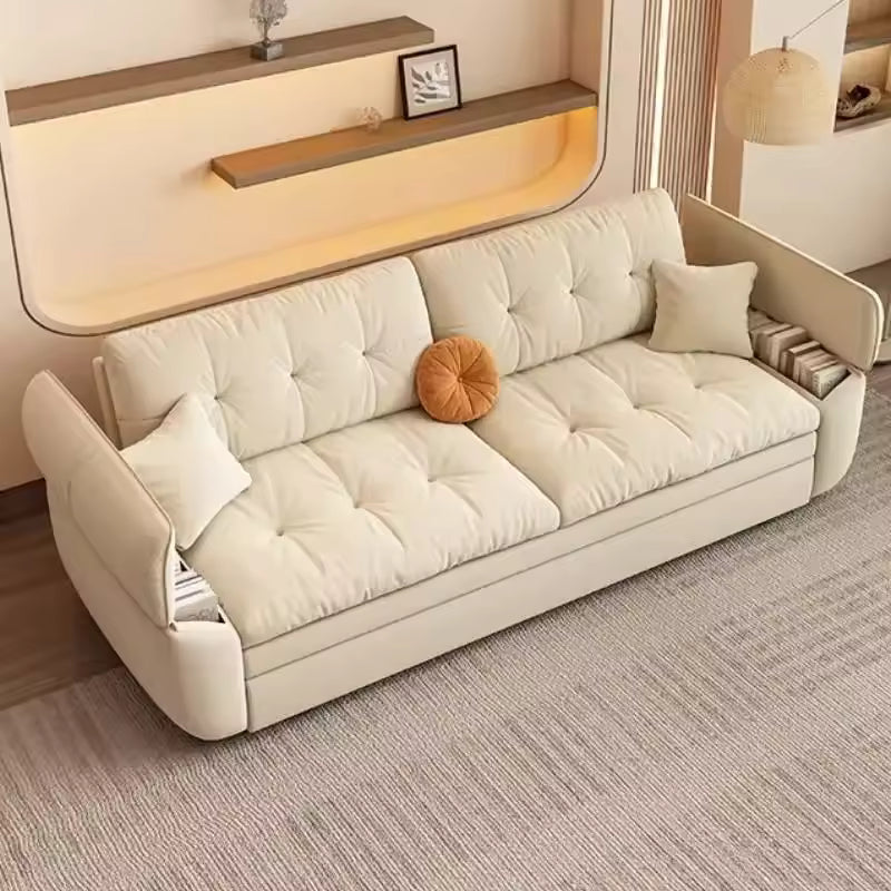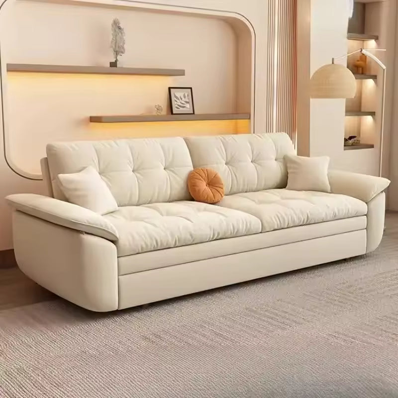 Place the sofa on a flat indoor surface. To convert it into a bed, pull the lower section outward and unfold it until the surface is fully extended. Adjust cushions as needed for comfort. After use, fold the section back and slide it into place to return the sofa to its original form.