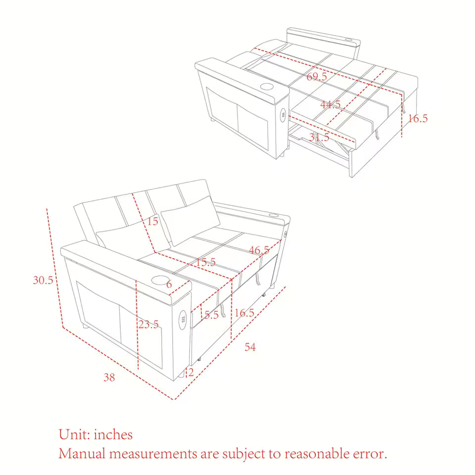 Place the sofa on a flat indoor surface. Adjust the backrest to the preferred seating or reclining position. To convert into a bed, pull the lower section outward until fully extended and aligned. Connect a compatible device to the USB port if needed. After use, slide the base back and return the backrest to the upright position.