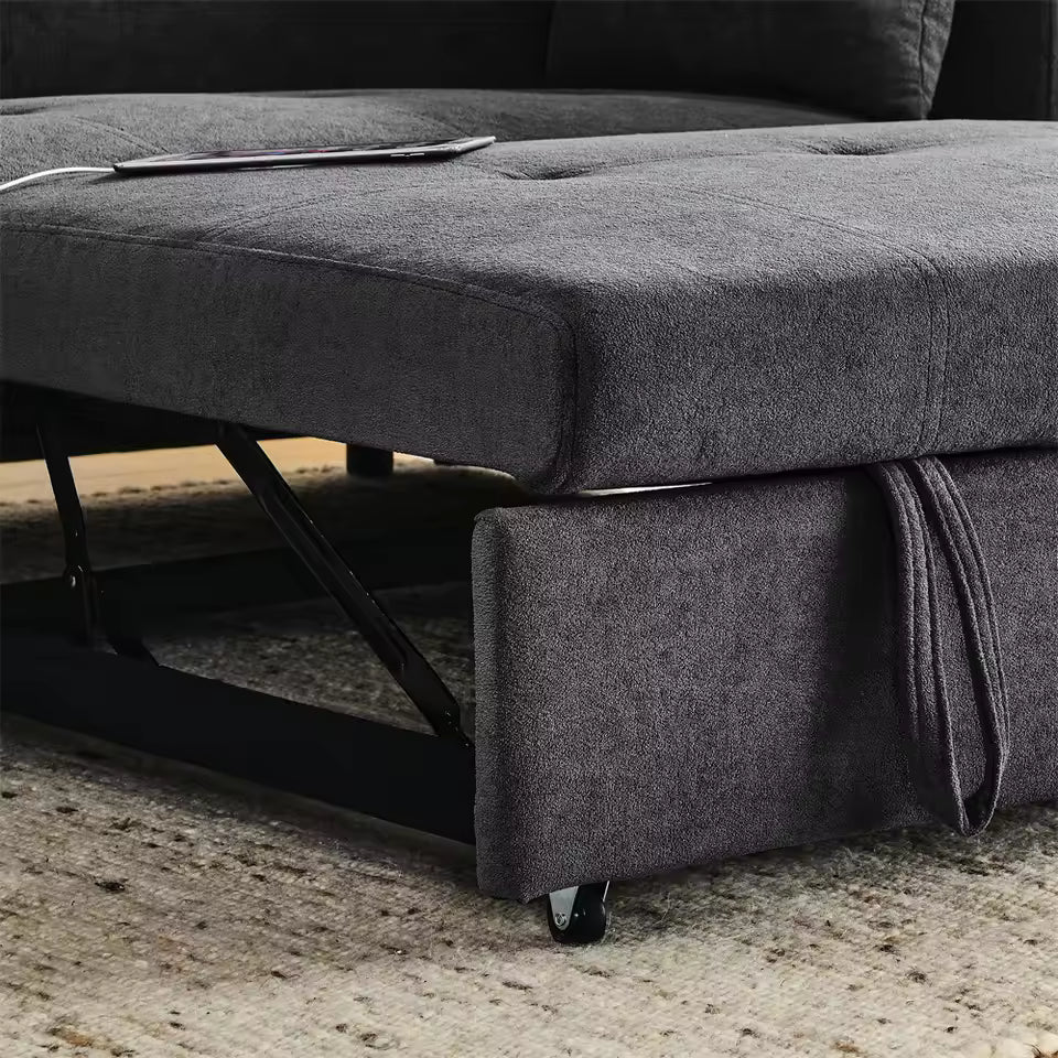 This pull out sofa bed is an indoor multifunctional furniture piece designed to support seating, reclining, and sleeping needs. It features an extendable base that converts the sofa into a flat sleeping surface, making it suitable for daily use and occasional rest. The sofa includes an adjustable backrest that allows different seating and reclining positions. A built-in USB port provides convenient access for charging small electronic devices while seated or resting. The padded seat and back cushions support balanced comfort during extended use.